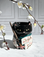 Black cat samurai cup with cherry blossom detail and gold accents.