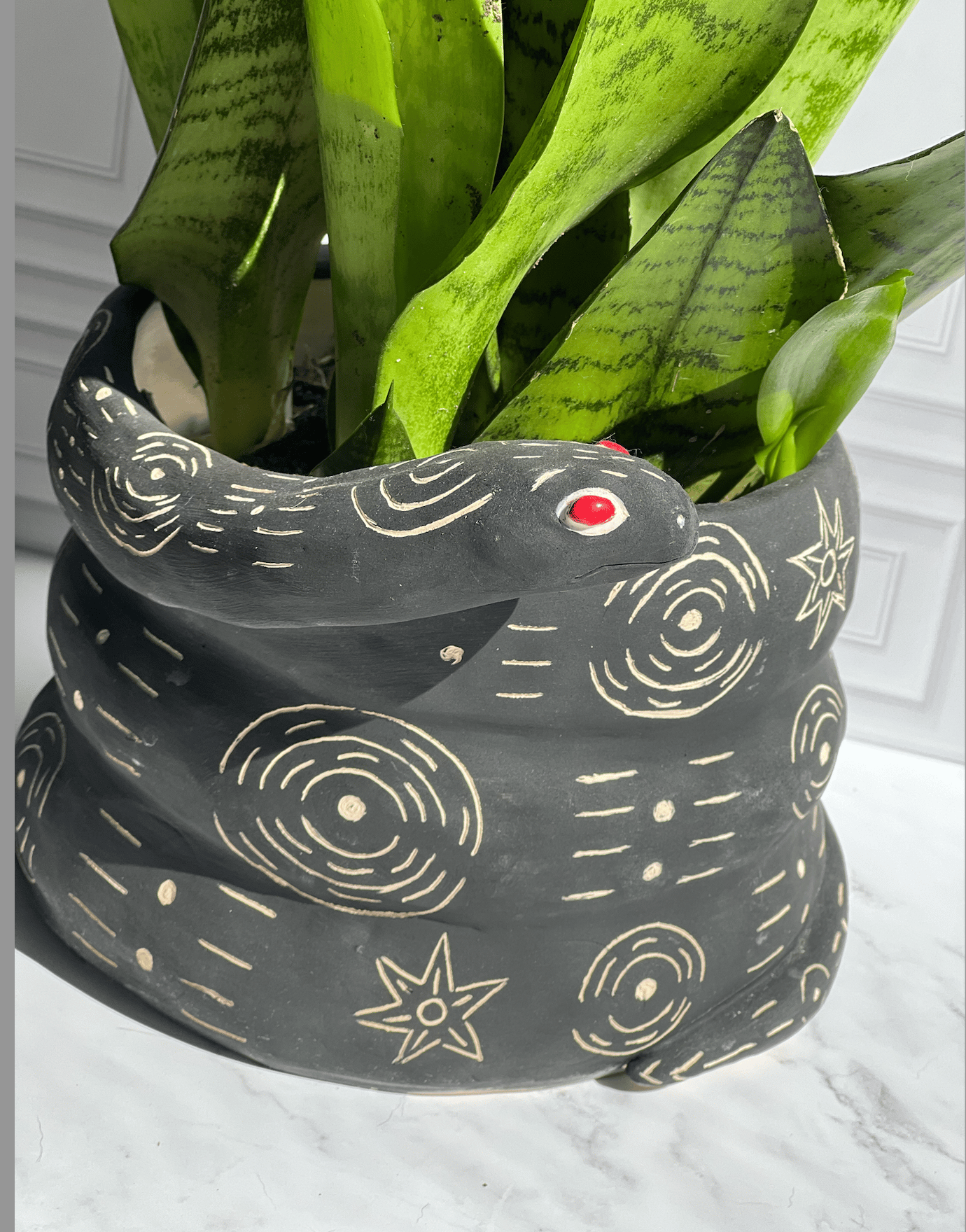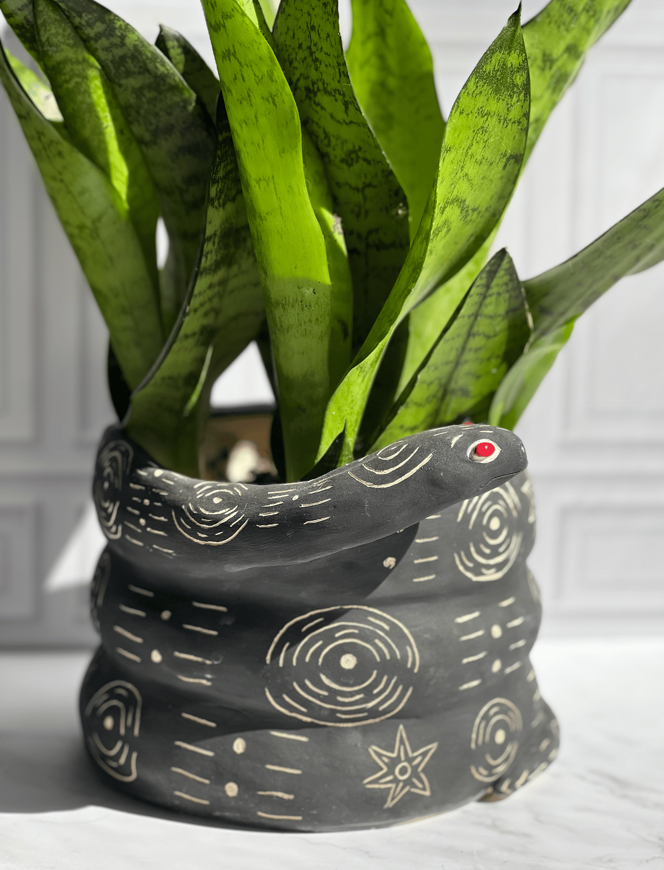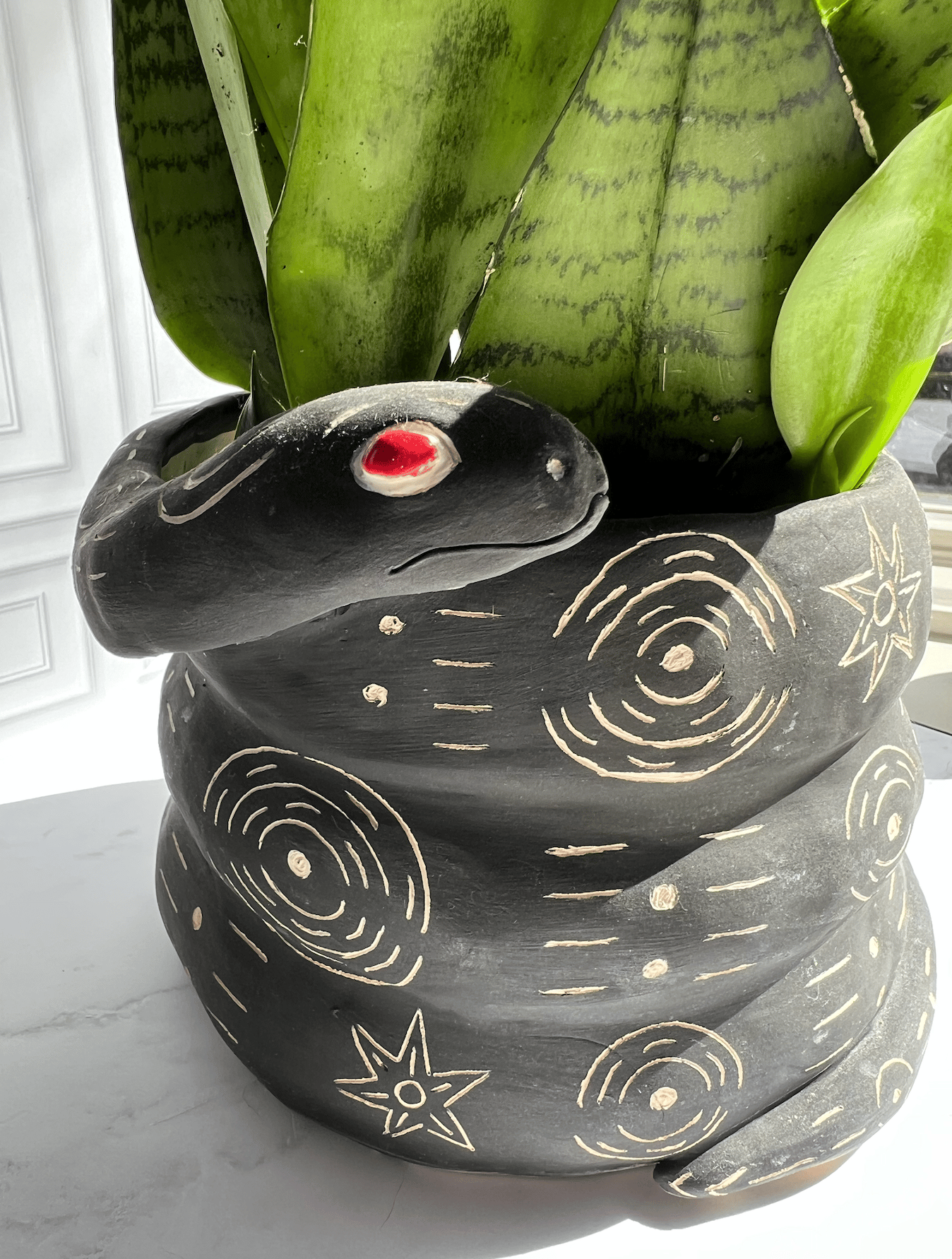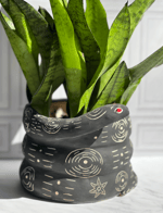 Snake planter, mat black with tribal design. 6"x8". Plant not included.